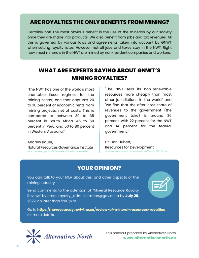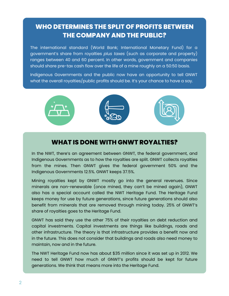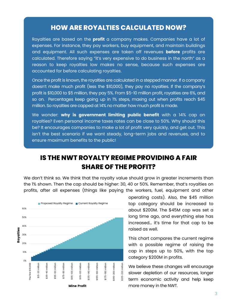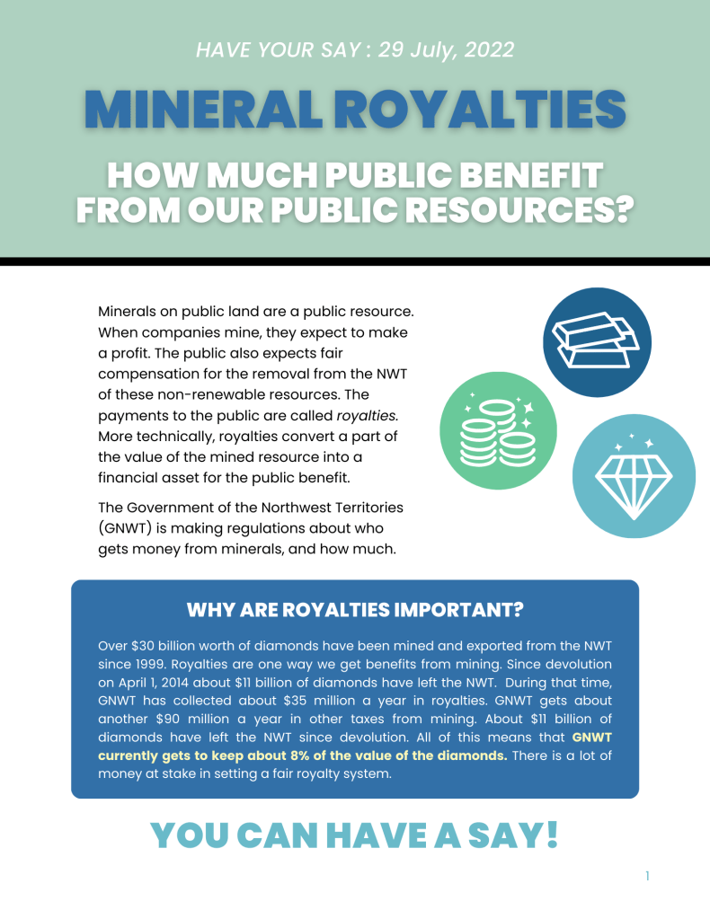 Description: Four-page pamphlet intended to inform the average Northerner of the Mineral Royalties Act. Greyscale versions of this document were distributed to every household in the NWT.